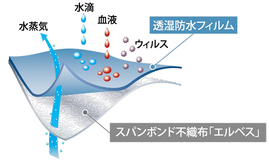 「ユニソフィア」は、今年2月に発表したユニチカ㈱のオレフィン系スパンボンド不織布「エルベス」と、優れた透湿防水機能を有する高バリア性フィルムを組み合わせた高機能複合不織布です。今回は、さまざまな医療現場での暑さ対策に関する多くのご要望に応えるため、新たに高透湿タイプを開発し供給を開始しました。